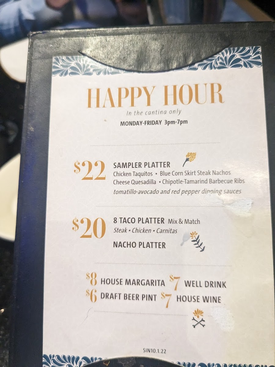 chicken taquitos, blue corn skirt steak nachos, cheese quesadilla, chipotle-tamarind barbecue ribs and tomatillo-avocado and red pepper dipping sauces